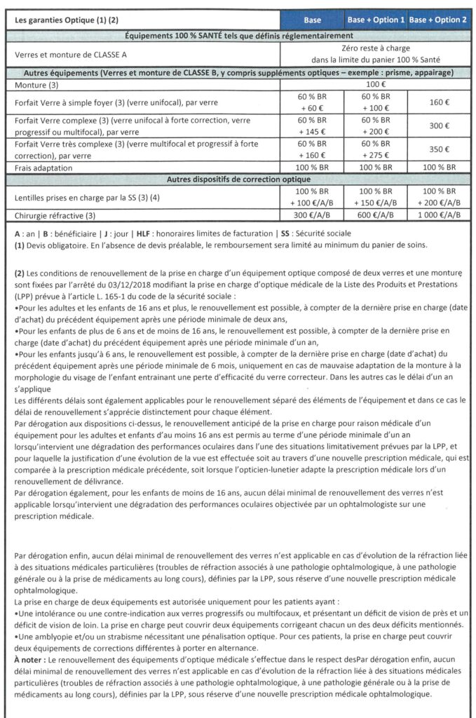 - Base + Option 2 (100 € de monture et 160 € par verre) : 100 € de monture + 214 € de verres = 314 €. Le reste à charge de l’assuré est de : 356 € – 314 € = 42 €.