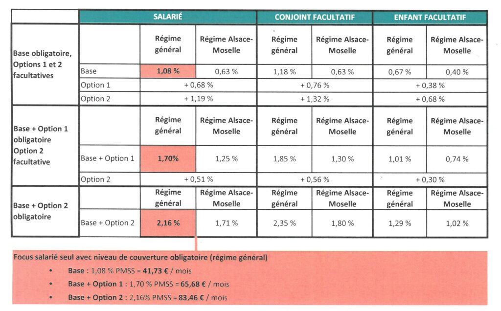 L’employeur choisir le niveau de couverture minimum qu’il rend obligatoire dans l’entreprise. Les cotisations et les prestations sont fonction du niveau de couverture retenu. L’employeur finance au minimum 50 % de la cotisation au régime rendu obligatoire (cf. question 10).