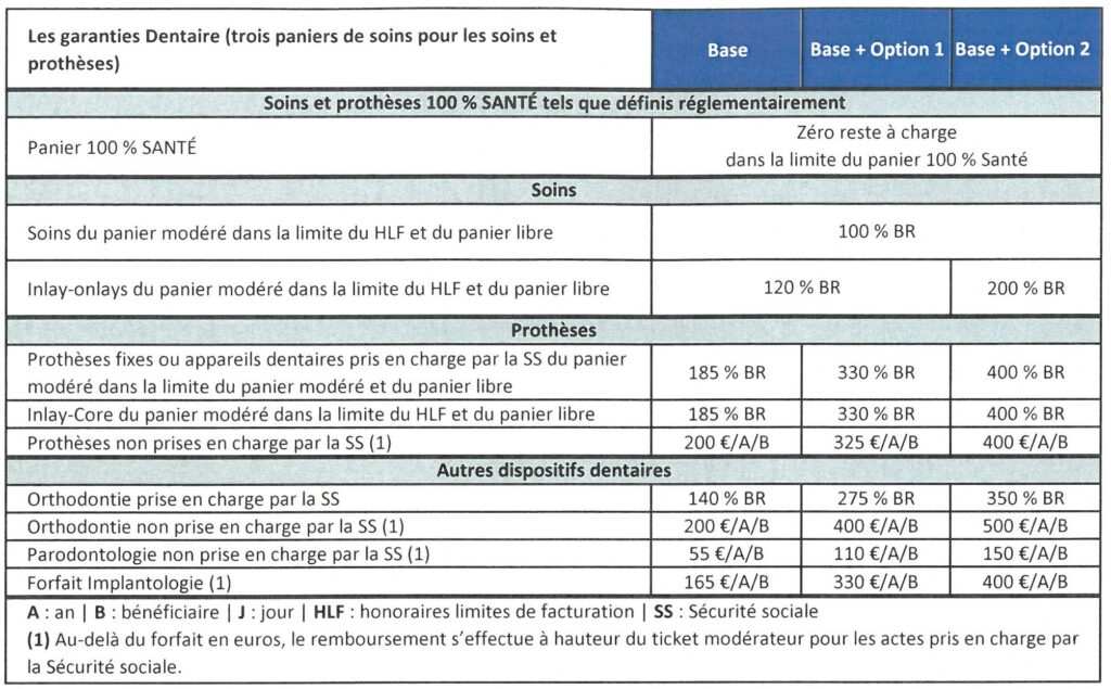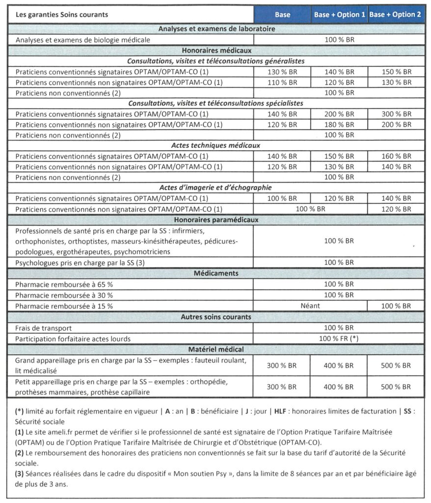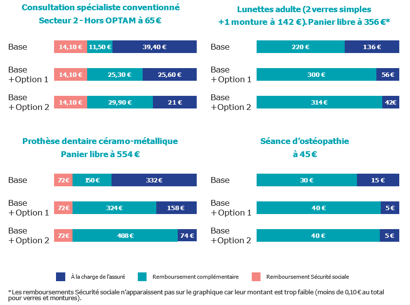 - Base + Option 2 : 40 €. Le reste à charge de l’assuré est de : 45 € – 40 € = 5 €.