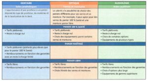 Il a été mis en place en dentaire, en optique et en audiologie. Le 100 % santé assure un reste à charge nul et une prise en charge intégrale des remboursements par la Sécurité sociale et la complémentaire santé si le salarié consomme des équipements dans ce panier.