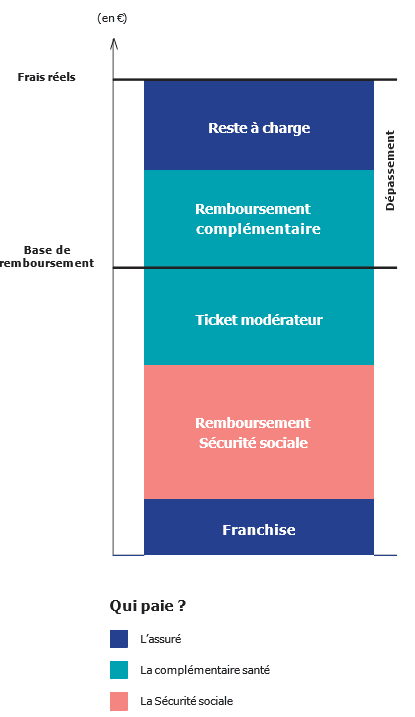 Parfois, les frais d’un acte médical peuvent aller au-delà de la base de remboursement. La partie supérieure à la base de remboursement s’appelle le dépassement. Il peut être pris en charge, intégralement ou partiellement, par la complémentaire santé. La partie qui n’est pas prise en charge s’appelle le reste à charge et elle est aux frais de l’assuré.